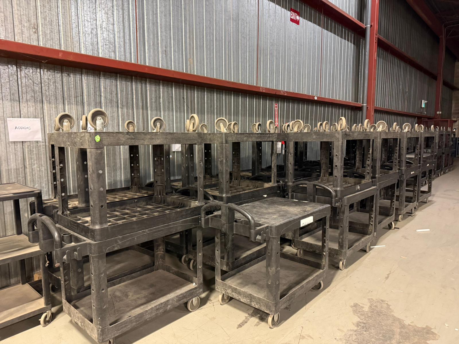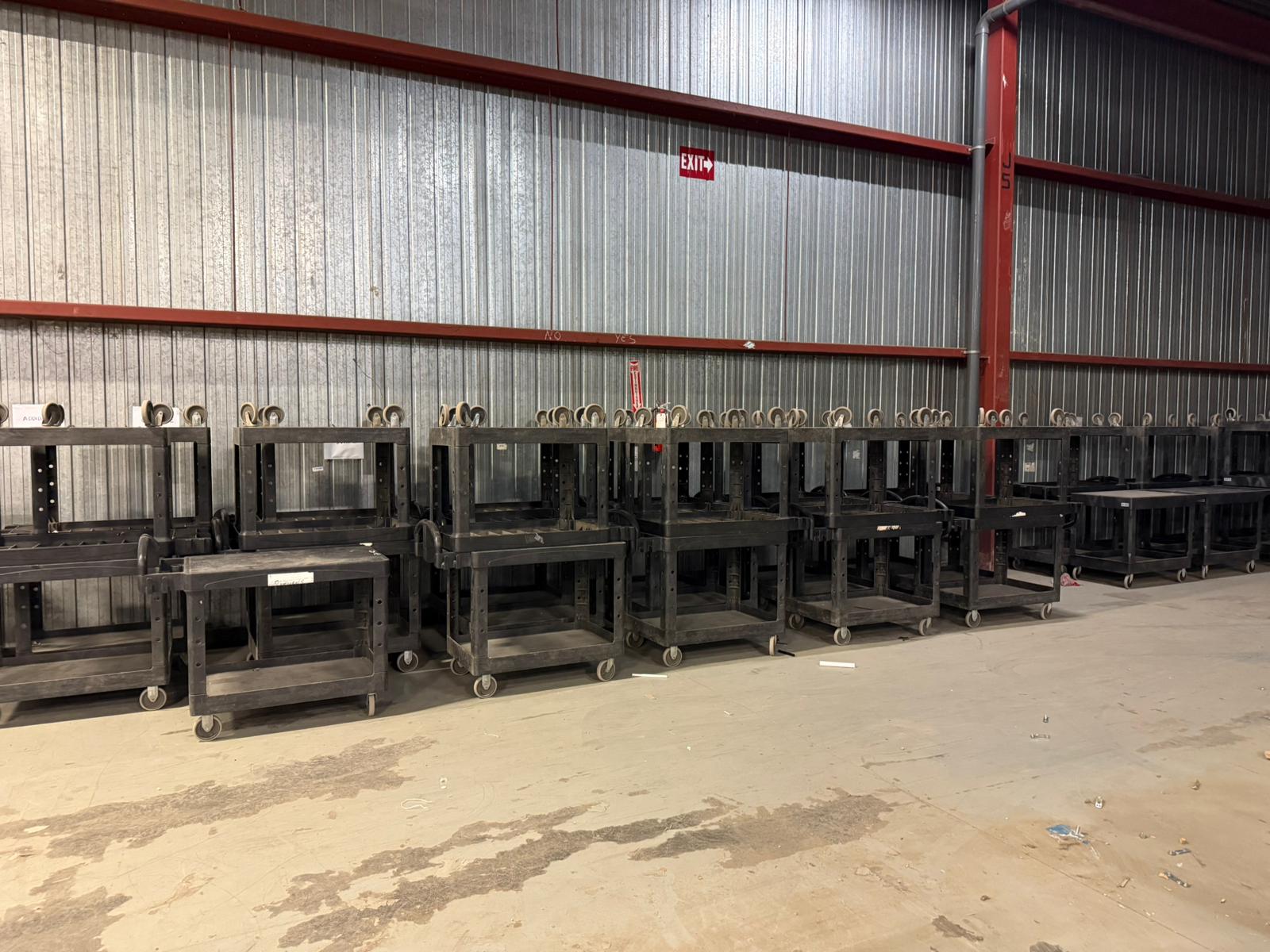 Durable Rubbermaid Utility Cart designed for warehouses, maintenance teams, workshops, and industrial environments. Built with strong structural foam that resists rust, dents, and chipping, making it ideal for demanding daily use. The ergonomic handle design allows easy maneuverability, while the top tray provides convenient storage for tools and small parts. Rounded edges help protect walls and equipment from damage during transport. Equipped with non-marking 5" casters for smooth rolling on warehouse and facility floors. Specifications: Model: H-2471 Dimensions: 44" L × 25" W × 33" H Load Capacity: 500 lbs Shelves: 2 Weight: 42 lbs Caster Type: 5" non-marking casters (2 swivel, 2 rigid with brake) Material: Structural foam construction