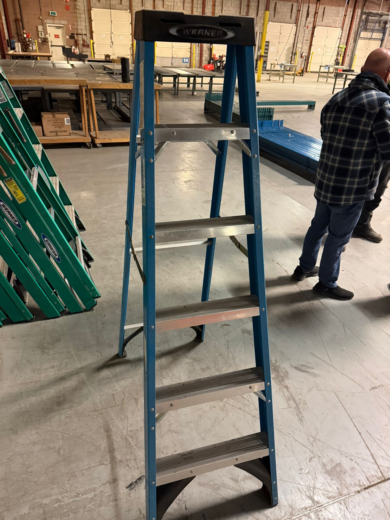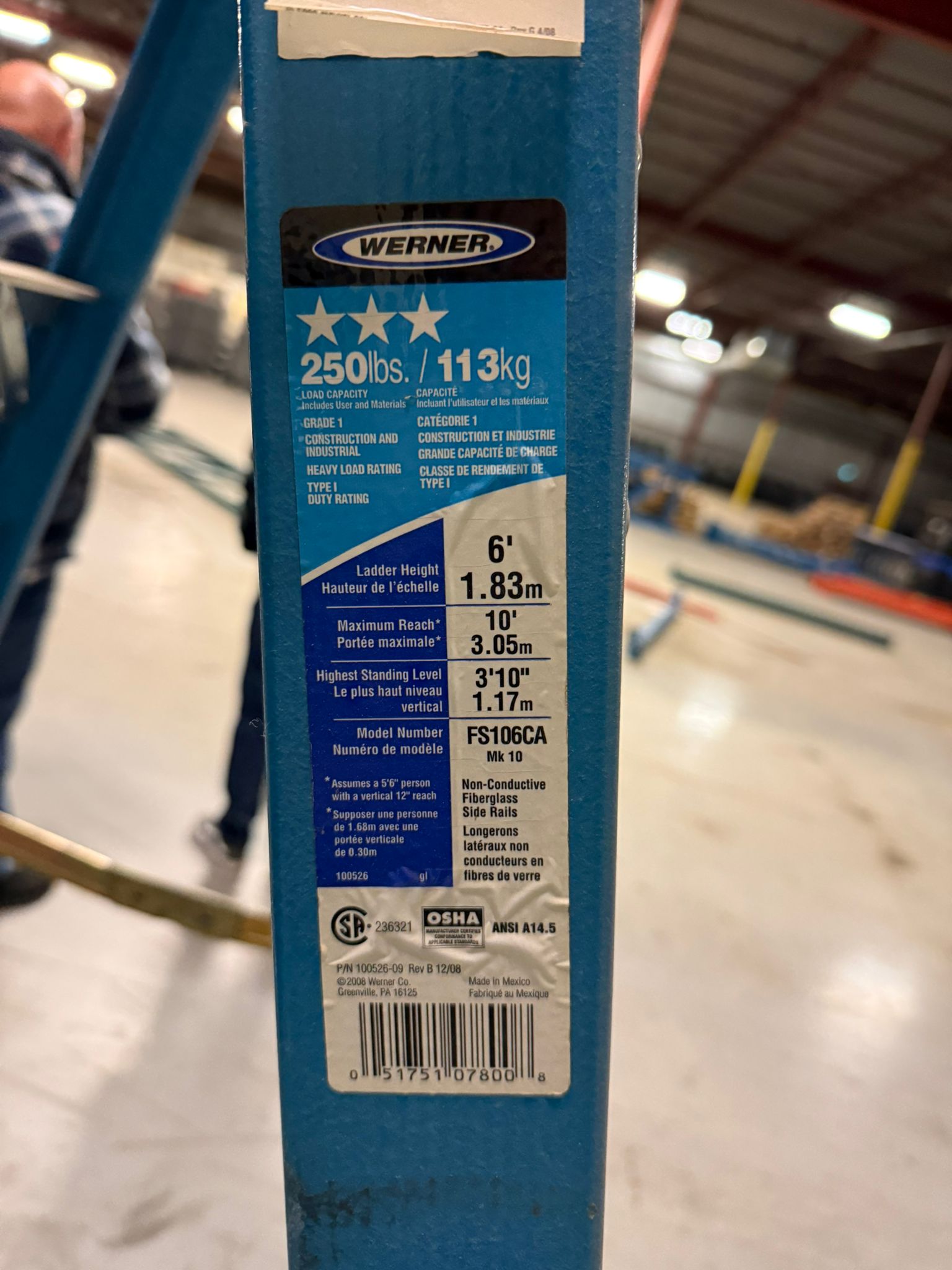 The Werner 6006 6-ft Fiberglass Step Ladder is a professional-grade ladder designed for construction, warehouse maintenance, and electrical work. Built with durable fiberglass rails, it is non-conductive, making it safe for use around electrical equipment. The ladder features TRACTION-TRED slip-resistant steps, a HolsterTop with Lock-In system for holding tools securely, and a paint can hanger for convenience while working. Heavy-duty EDGE bracing improves strength and durability, while pinch-proof external spreaders add safety and stability. Specifications Brand: Werner Model: 6006 Height: 6 ft Reach Height: ~10 ft Load Capacity: 250 lbs Duty Rating: Type I Material: Fiberglass Design: Single-sided step ladder Steps: Slip-resistant TRACTION-TRED steps Top: HolsterTop with tool slots and paint can hanger Safety: Non-conductive fiberglass rails