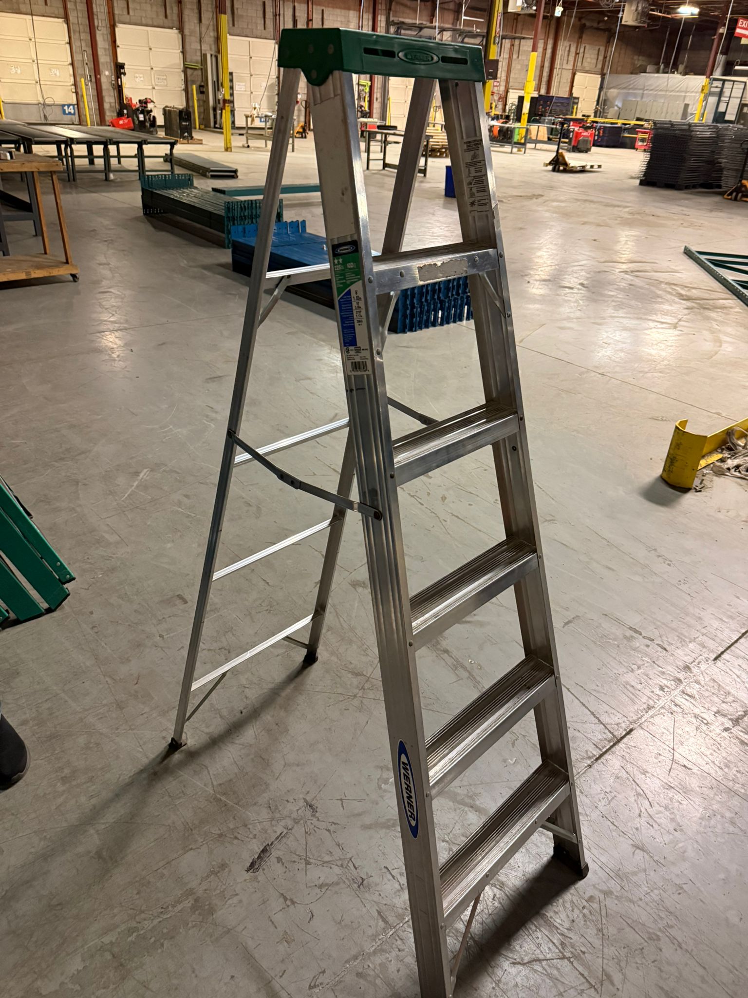The Werner 356CA 6 ft Aluminum Step Ladder is a lightweight yet durable ladder designed for warehouse maintenance, facility operations, and general industrial use. Built with strong aluminum rails and slip-resistant steps, it provides stable and secure climbing for everyday tasks. The ladder features reinforced spreaders for stability and non-slip feet for safe use on warehouse and shop floors. Its compact design makes it easy to transport and store while still providing a reach height of approximately 10 feet. Ideal for maintenance crews, warehouse operations, and general facility work. Specifications Brand: Werner Model: 356CA Material: Aluminum Height: 6 ft Reach Height: ~10 ft Load Capacity: 225 lbs Duty Rating: Type II Highest Standing Level: 3 ft 10 in Color: Aluminum / Green top