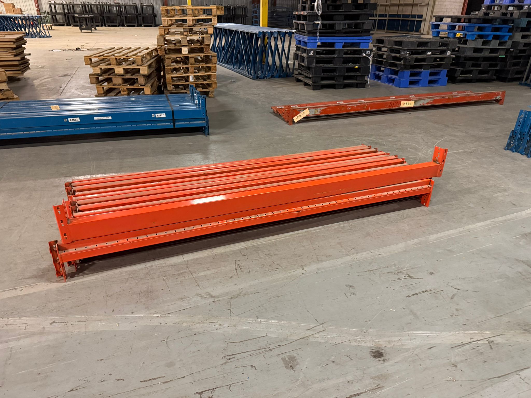 Heavy-duty 96-inch pallet rack beams designed for warehouse storage systems. These steel step beams connect pallet rack uprights to create horizontal load levels for pallet storage. The 4" beam face provides strong load capacity and is compatible with standard pallet rack systems. These beams are commonly used in warehouses, distribution centers, and industrial storage facilities. Ideal for expanding existing pallet rack systems or building new pallet storage rows. Specifications Type: Pallet Rack Beam Length: 96 in (8 ft) Beam Face: 4 in Material: Heavy-duty steel Color: Orange Connection: Hook-style beam connector Application: Warehouse pallet racking
