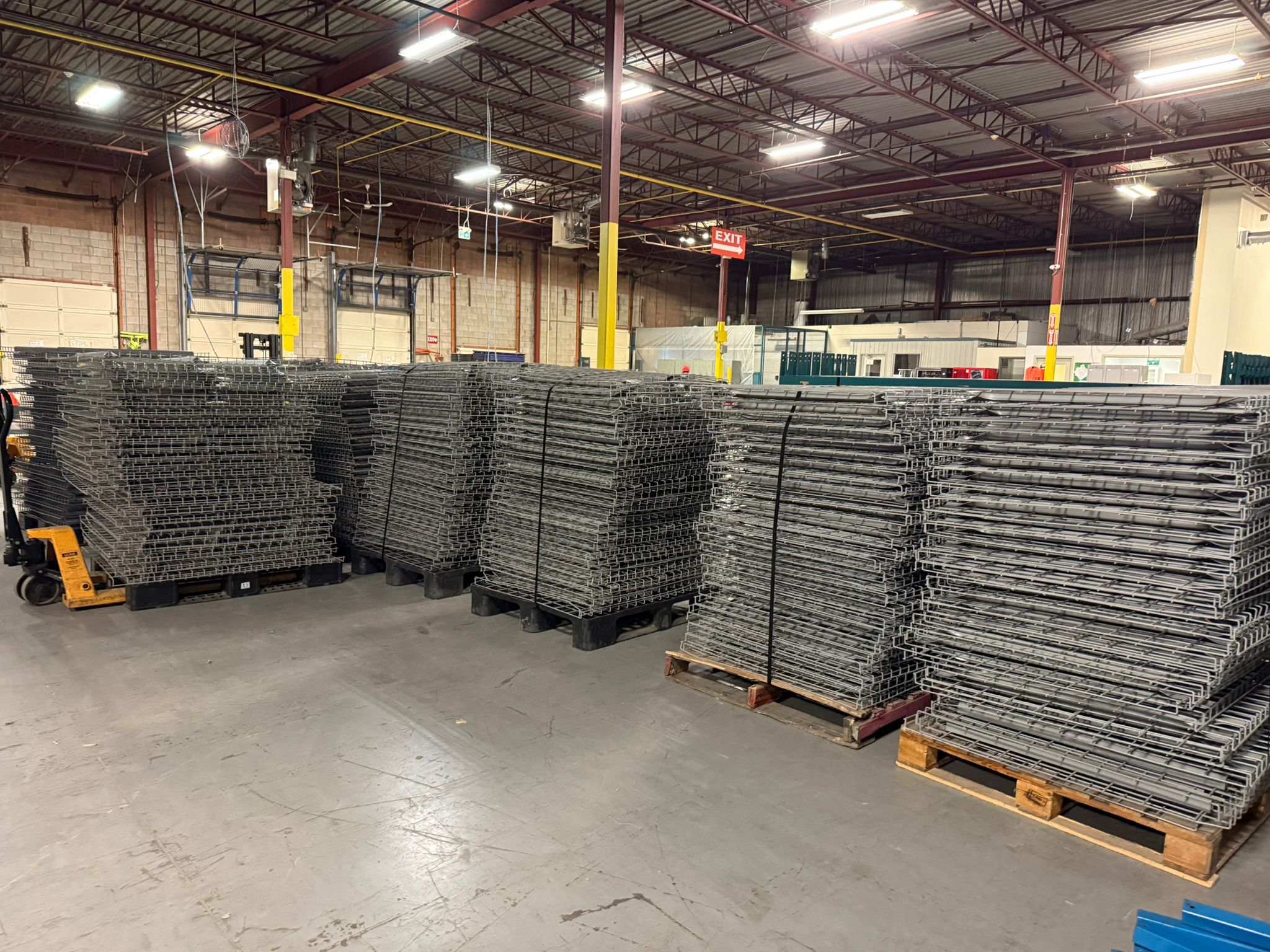 Heavy-duty 44" × 46" pallet rack wire decking designed for industrial pallet rack storage systems. These galvanized steel decks sit securely on pallet rack beams and create a stable surface for storing pallets, cartons, and loose inventory. The waterfall edge design locks the deck onto the beam face, preventing movement and increasing strength. Wire decking improves airflow and allows fire sprinkler penetration, making it safer than solid shelving. These decks are commonly used in warehouse pallet racking systems and distribution centers. Specifications Type: Pallet Rack Wire Deck Dimensions: 44" W × 46" D Material: Galvanized steel Finish: Rust-resistant galvanized coating Mesh Size: Approx. 2.5" × 4" grid Support Channels: Reinforced steel channels underneath Design: Waterfall edge beam support Application: Warehouse pallet rack storage
