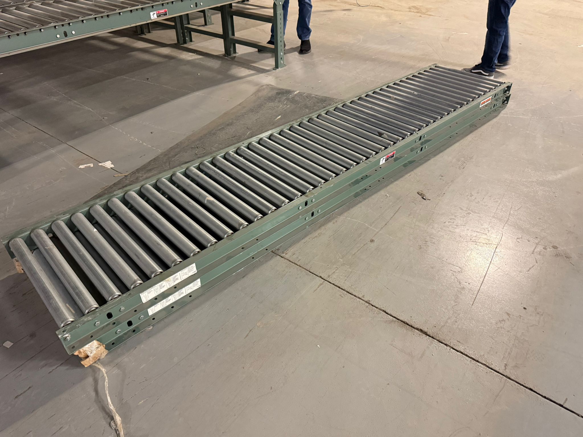 Heavy-duty gravity roller conveyor section designed for smooth and efficient movement of cartons, totes, and packages in warehouse and distribution environments. This conveyor uses free-spinning steel rollers that allow materials to move easily without motors or power. This 120-inch long and 24-inch wide conveyor section is built with a durable steel frame and industrial rollers. It can be installed on existing conveyor systems, mounted on custom supports, or integrated into warehouse packing and sorting lines. Since this unit does not include legs, it is ideal for adding onto existing conveyor setups or for custom installations. Specifications Type: Gravity Roller Conveyor Length: 120 in (10 ft) Width: 24 in Roller Material: Steel rollers Frame Material: Heavy-duty steel Operation: Non-powered gravity conveyor Mounting: Designed to attach to conveyor supports or existing systems