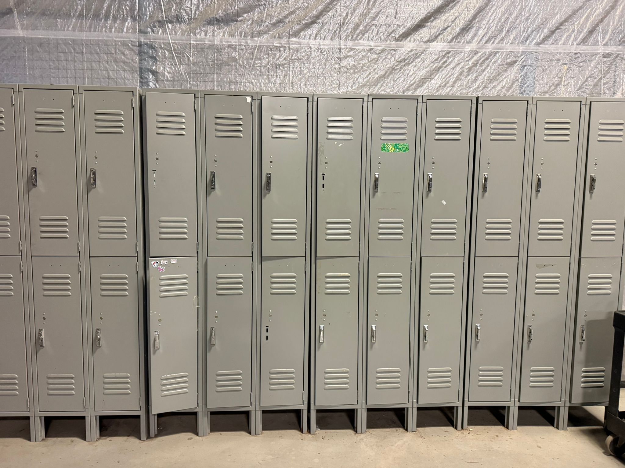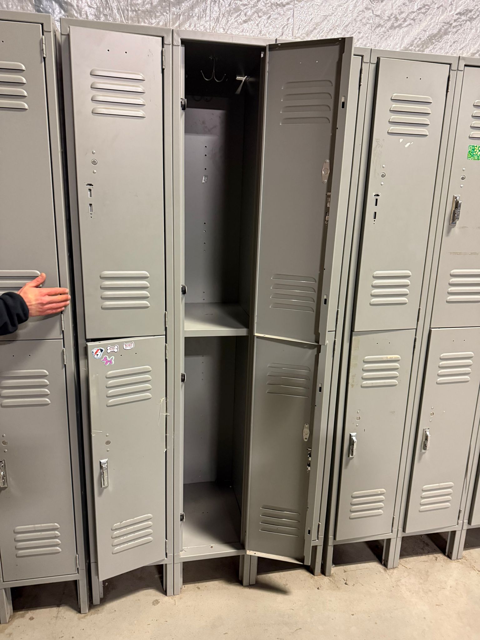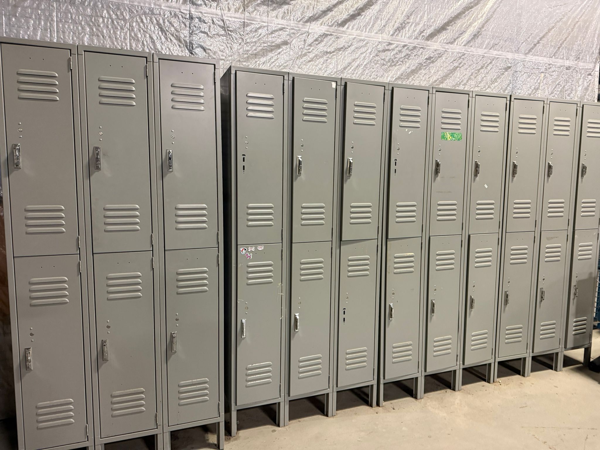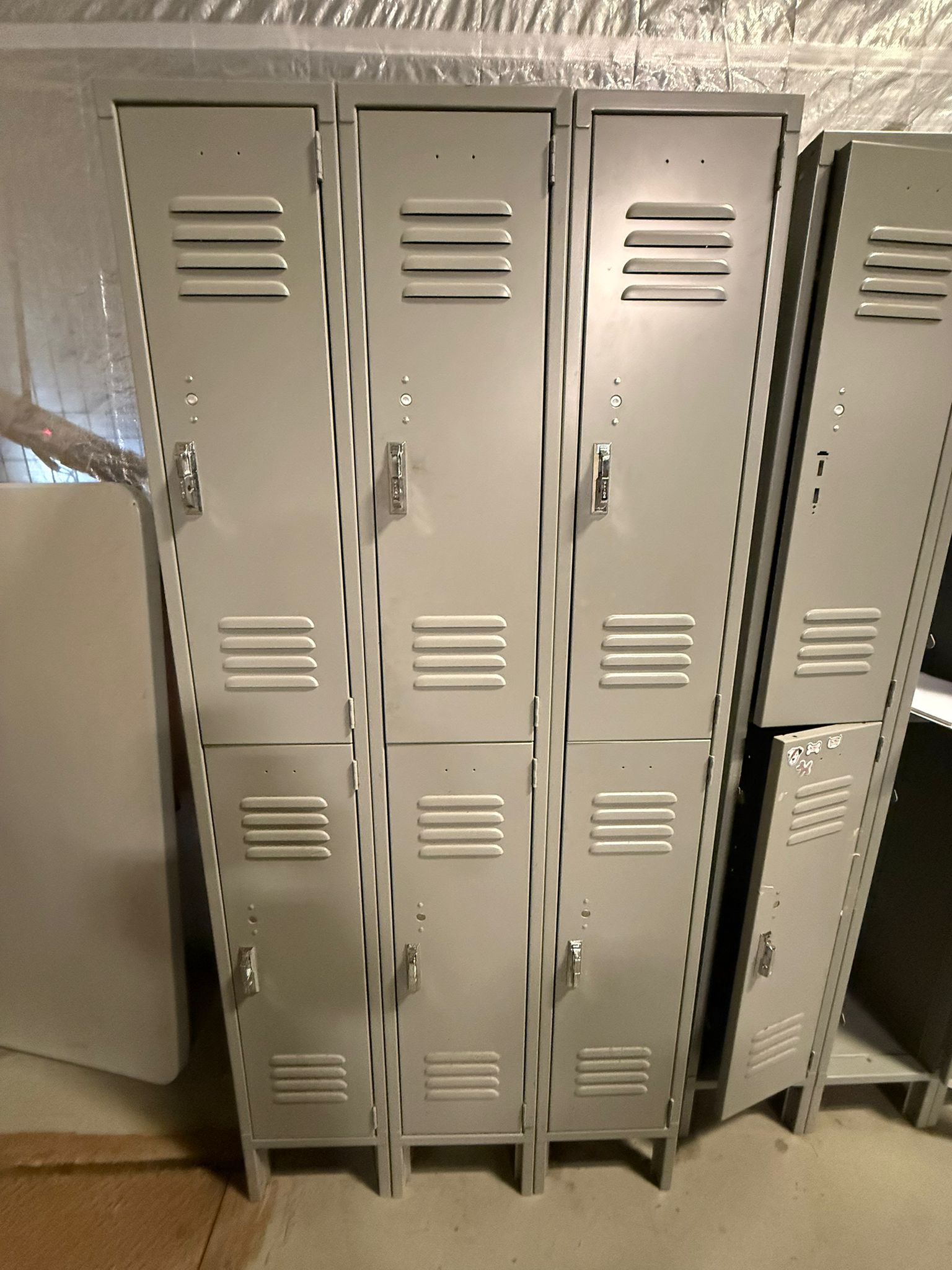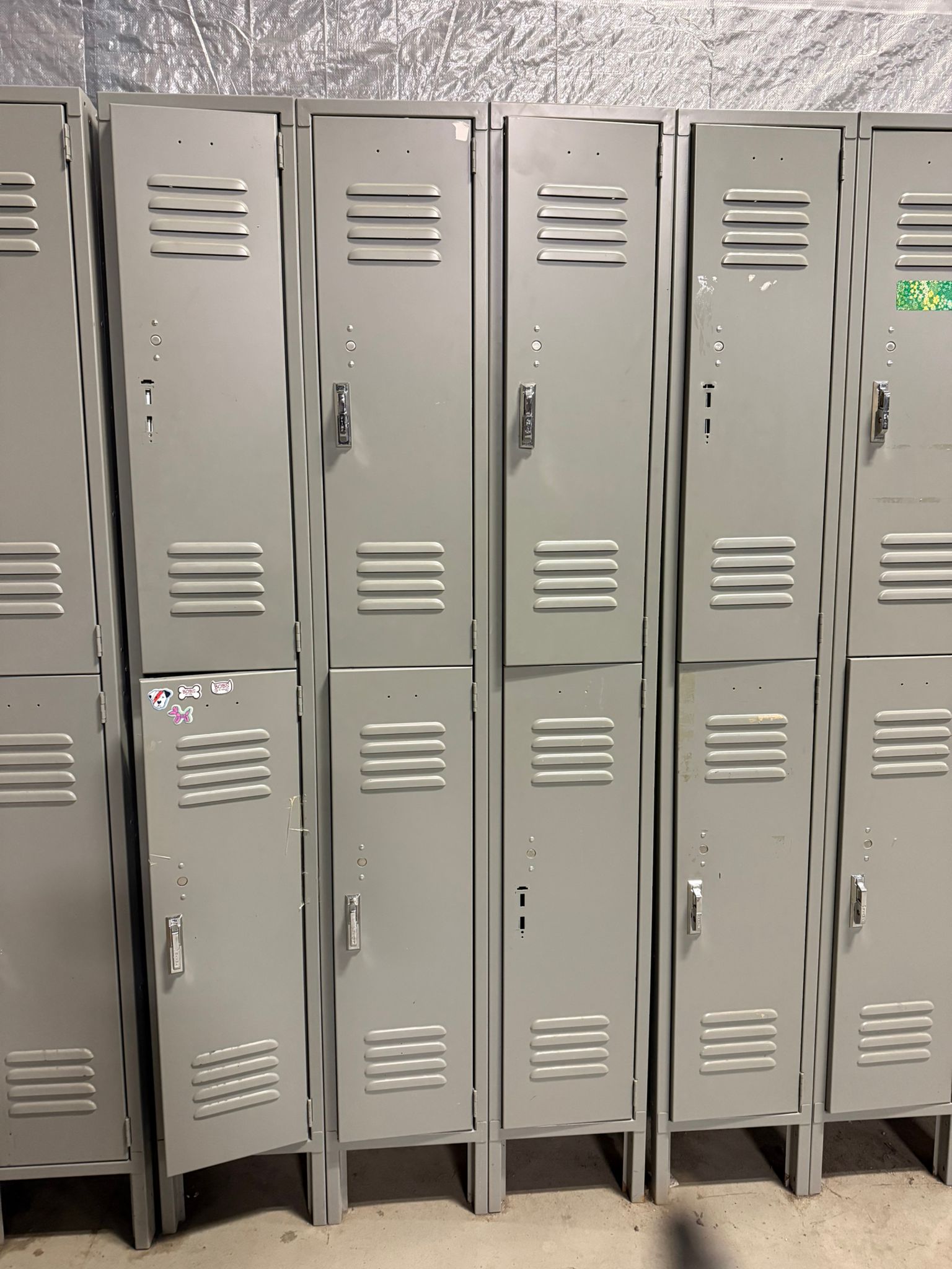 Heavy-duty 6-door steel locker unit designed for employee storage in warehouses, workshops, factories, gyms, and industrial facilities. These lockers provide secure storage for personal belongings, work gear, and safety equipment. Each unit features six individual compartments, durable steel construction, and ventilated locker doors for airflow. The compact vertical design maximizes storage while saving floor space. Ideal for staff locker rooms, warehouses, factories, construction sites, schools, and gyms. Specifications Type: Steel locker unit Doors: 6 compartments (2 tier × 3 columns) Material: Heavy-duty steel Color: Light gray Ventilation: Louvered door vents Lock Type: Padlock compatible latch Base: Raised metal base